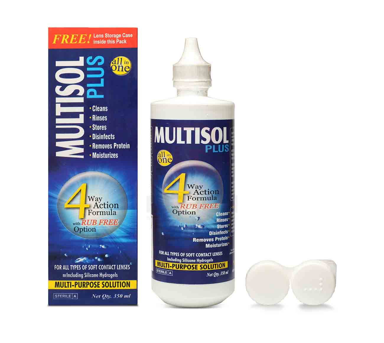 Description- 1 unit of 350 ml bottle + 1 contact lens case.Multisol is a multifunctional all-in-one solution for cleaning,